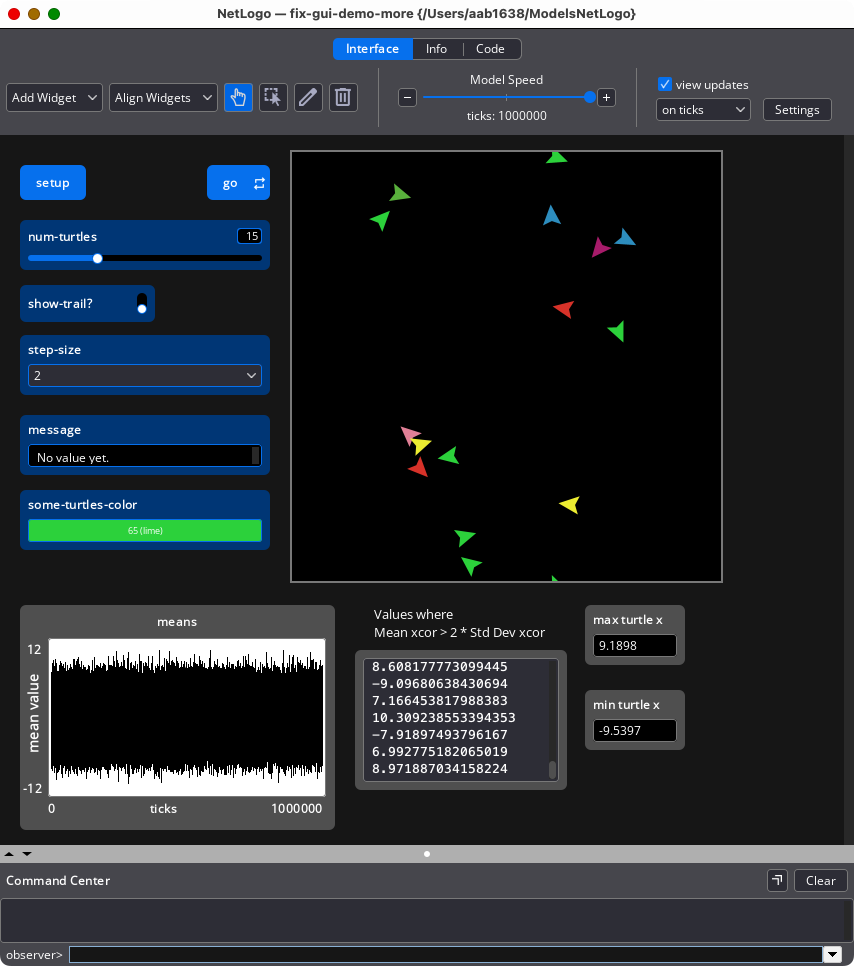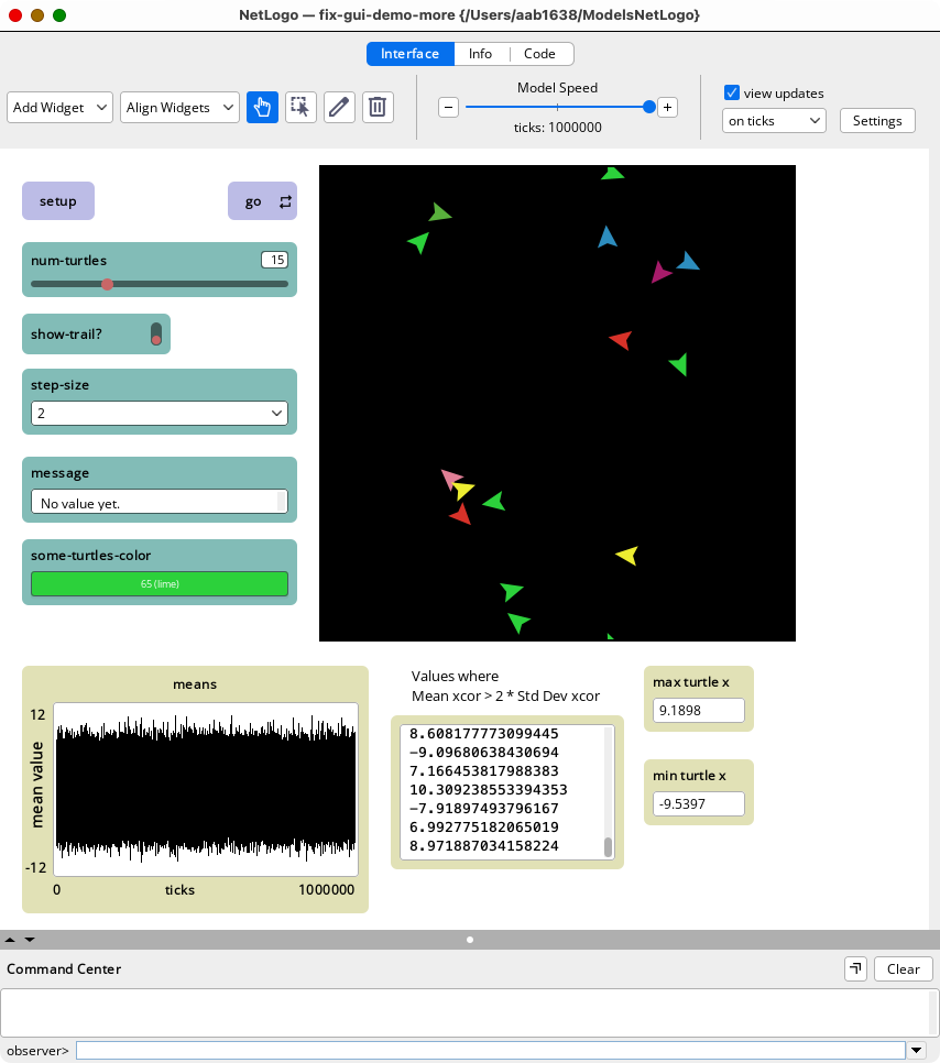 By default NetLogo will now collect anonymous usage statistics from users while the application is running. Uncheck this option to disable data collection. When this option is enabled, NetLogo will collect information about your usage of tools and features of the NetLogo application and the NetLogo language. This information is analyzed by the NetLogo team in order to understand how often certain NetLogo features are being used, so as to inform development priorities. No personal or identifying information will be collected. If you have any questions or concerns about the collection and storage of this data, feel free to contact the NetLogo team at feedback@ccl.northwestern.edu.