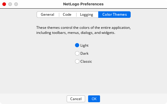 Use the check boxes, pull-down menus and text fields to change the default preference values. When you are done, click the OK button to save your changes, or the Cancel button to revert the preferences to the state they were in before you opened the dialog. Most preferences take effect immediately. You must exit and re-open NetLogo for the preferences that indicate “(restart required)” to take effect.