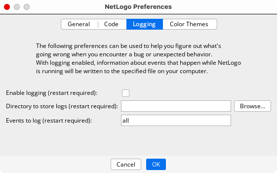 Specifies the directory to which log files will be written. You can type in the directory name, or select a directory using the Browse… dialog. NetLogo must be restarted for this preference to take effect.